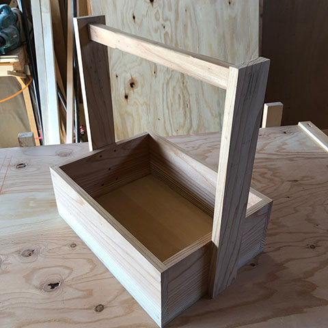 平台製作依頼のお客様へ ツカミ金物収納用のオカモチを作ります。 杉材無垢で製作、軽くてとても便利です。